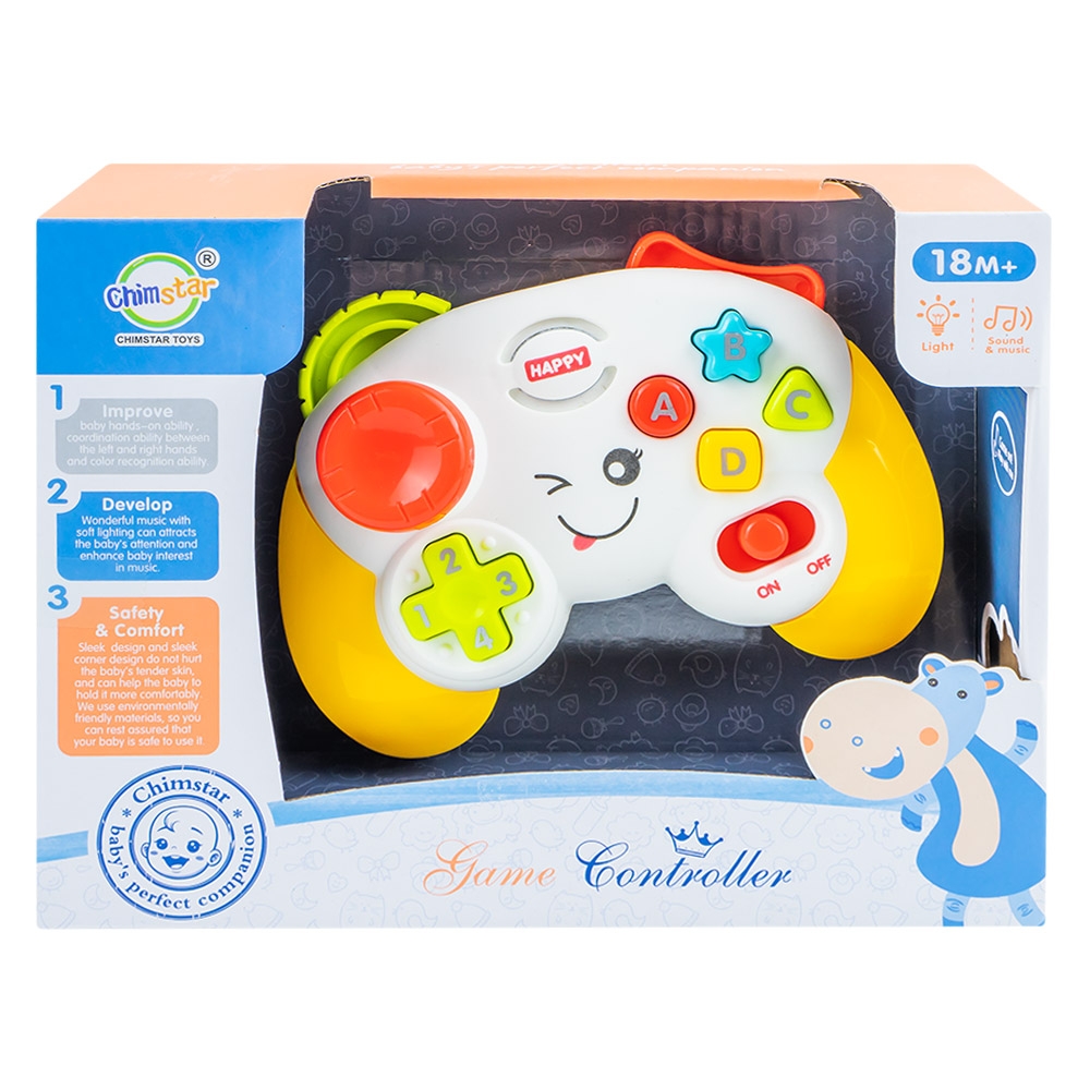 – Jucaria, cu forma de game controller cu fata zambitoare, are butoane colorate si joystick pentru declansare sunete si lumini.