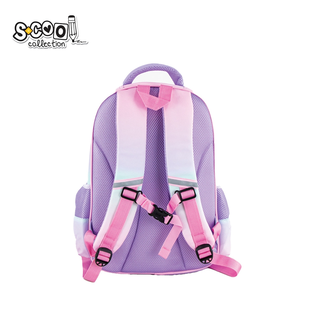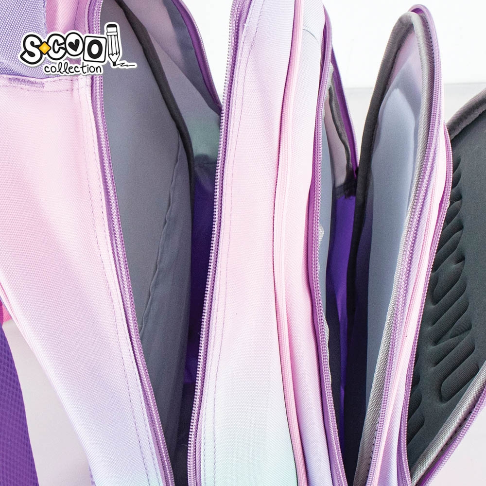 – Acesta are o compartimentare eficienta. Astfel, compartimentul principal ofera un spatiu generos si are un separator cu doua niveluri, prevazut in partea superioara cu banda elastica. Separatorul ajuta la sustinerea rechizitelor in pozitie verticala, in siguranta si, in acelasi timp, cea mai mare greutate ramane in apropierea spatelui, usurand purtarea. Compartimentul secundar este prevazut cu un organizator potrivit pentru asezarea unor obiecte mai mici. Organizatorul este format dintr-un buzunar cu dimensiune de 20×16 cm, peste care sunt suprapuse alte patru buzunare mai mici, unul de 12×12.5 cm, potrivit pentru telefon sau notesuri si alte trei de 2.5×12.5 cm, pentru depozitare instrumente de scris. Buzunarul frontal are carcasa rezistenta, din spuma EVA cu imprimeu 3D Unicorn, articolele transportate in interior fiind protejate de socuri. Inchiderea celor doua compartimente si a buzunarului frontal se realizeaza cu fermoare cu extractoare decorative, compartimentul principal avand dubla tragere.