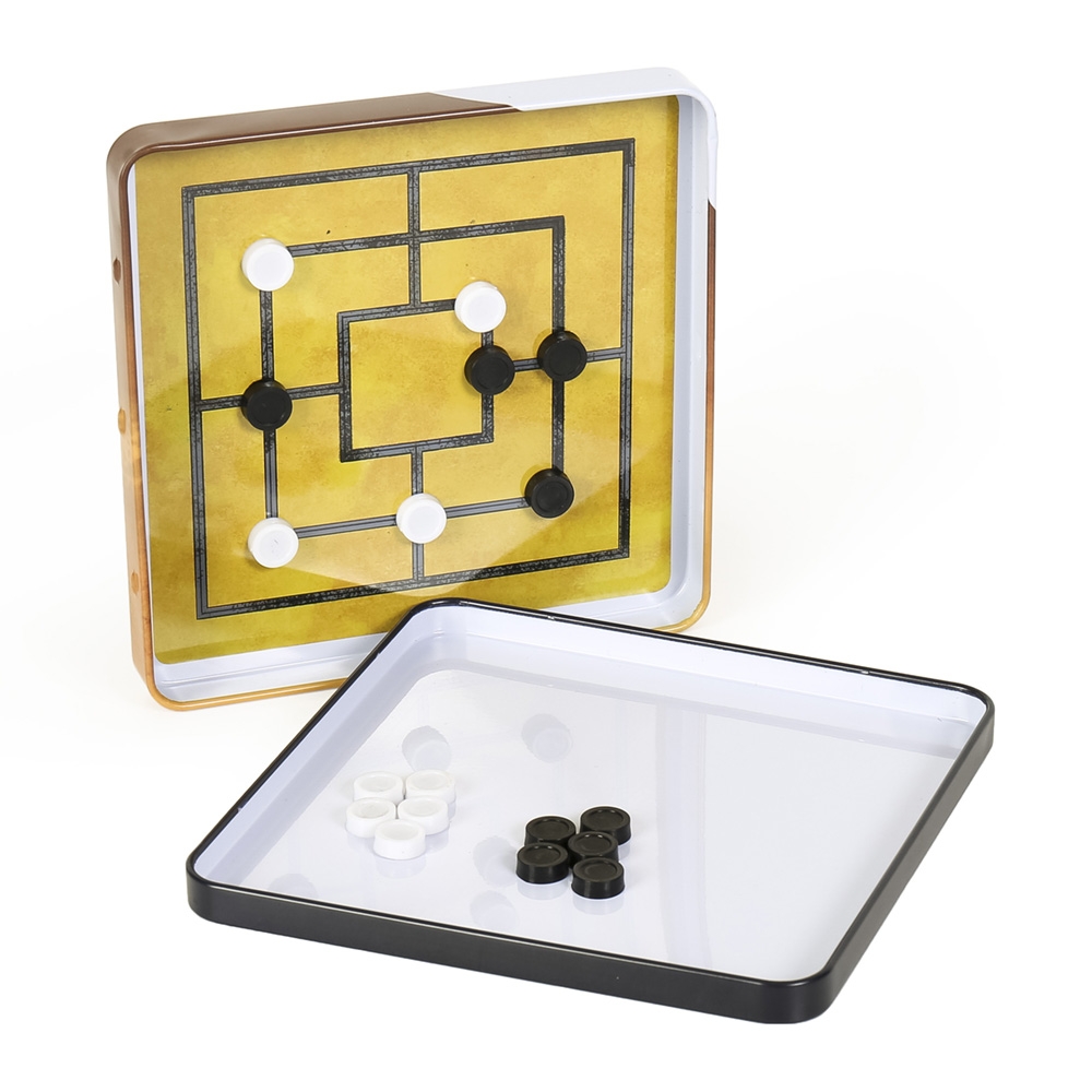 – La inceputul partidei tabla de joc este goala. Jocul se desfașoara in doua etape. In prima etapa jucatorii pun pe rand cite una din piesele proprii pe punctele tablei de joc. Aceasta etapa se incheie cand sunt plasate pe tabla toate cele 18 piese. In a doua etapa jucatorii muta pe rand cate una din piesele proprii. Scopul urmarit de fiecare jucator este de a elimina una cate una piesele adversarului. Pierde jucatorul care fie ajunge sa aiba numai doua piese, fie nu-si poate muta nicio piesa.