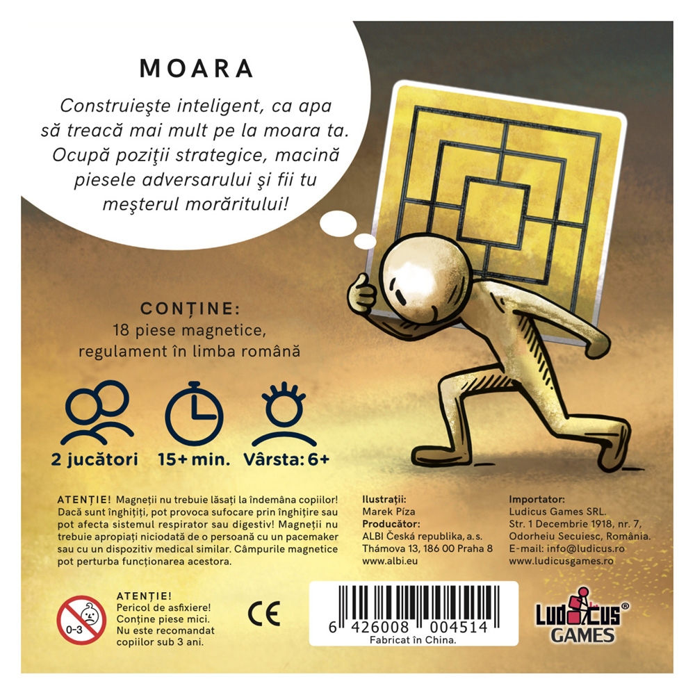 Construieste inteligent, ca apa sa treaca mai mult pe la moara ta. Ocupa pozitii strategice, macina piesele adversarului si fii tu mesterul moraritului! Jocul Moara, magnetic este un joc care stimuleaza atentia, memoria, dar si imaginatia, iar acum vine cu un design revizuit si atractiv. Reguli simple pentru jocuri portabile, in cutii metalice