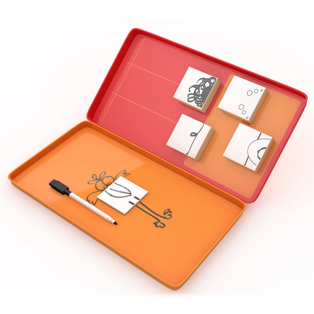– Setul contine 30 de cartonase magnetice desenate, tabla de joc (interiorul cutiei), marker nepermanent cu burete de sters.