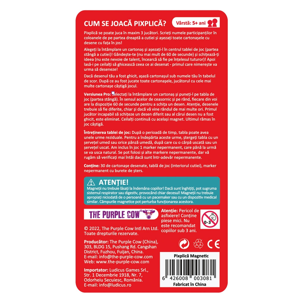 – Mod de joc: Scrieti numele participantilor pe tabla si selectati primul jucator care incepe. Alegeti la intamplare un cartonas si asezati-l in centrul tablei de joc (partea stanga a cutiei). Grabeste-te (nu mai mult de 60 secunde) si schiteaza-ti ideea, incercand sa fi pe intelesul tuturor, apoi lasa pe ceilalti sa ghiceasca ceea ce ai desenat. Primul care ghiceste va urma sa deseneze. Daca desenul tau a fost ghcit aseaza cartonasul sub numele sau in tabelul de scor. Dupa ce au fost jucate toate cartonasele, jucatorul cu cele mai multe cartnase castiga jocul. Jocul poate fi jucat si intr-o alta versiune. Selectati la intamplare un cartonas si asezati-l pe tabla. In sensul acelor de ceasornic si pe rand fiecare jucator schiteaza un desen. Atentie, desenele trebuie sa fie diferite, chiar daca va vine randul de mai multe ori. Primul jucator care nu poate desena diferit sau nu ghiceste va fi eliminat. Ceilalti continua cu acelasi magnet. Ultimul ramas in joc castiga.