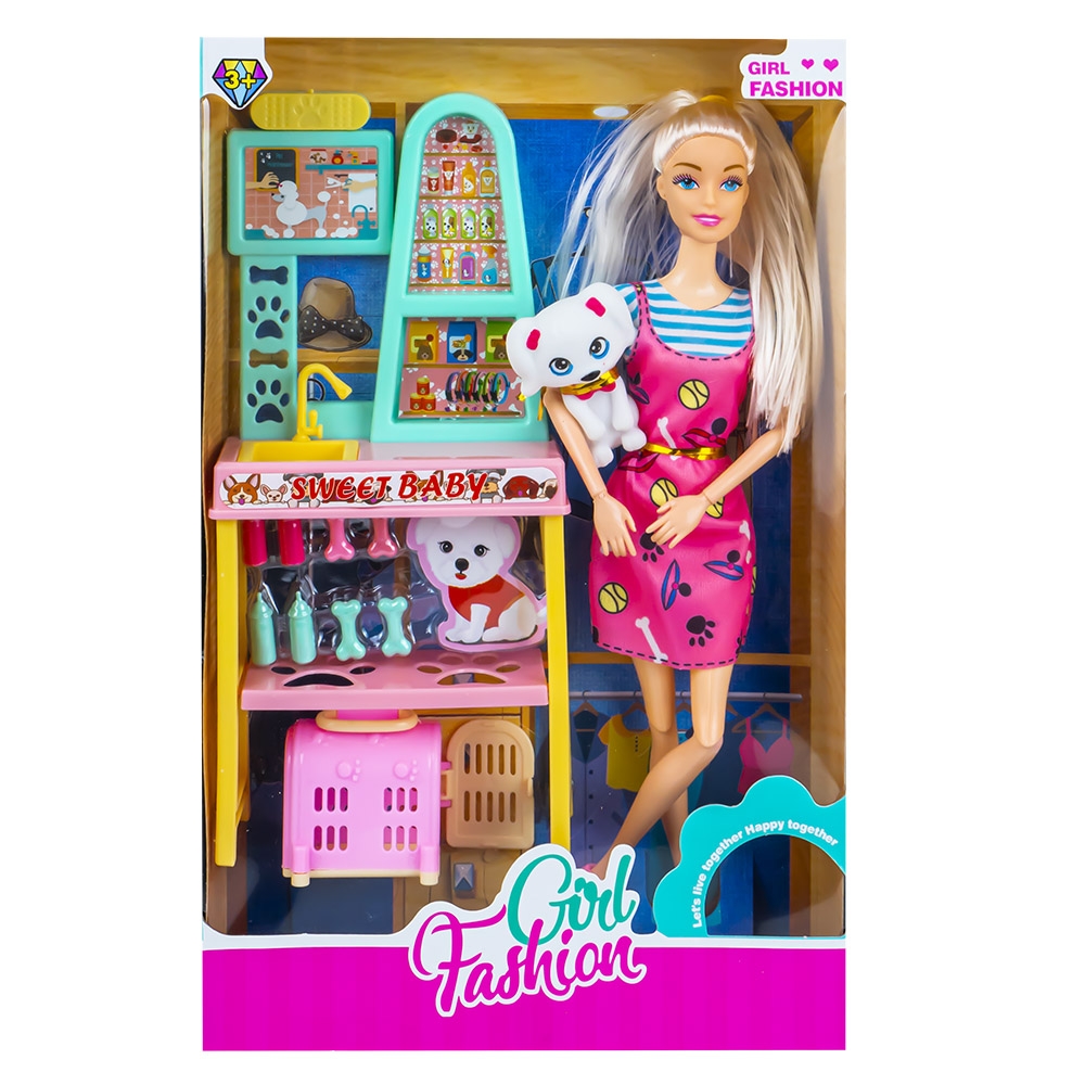 – Setul contine: 1 x papusa, 1 x catel, 1 x masuta pentru toaleta animalelor (are etajera si chiuveta), cusca pentru transport caine, 4 oase, 4 sticle cu biberon.
