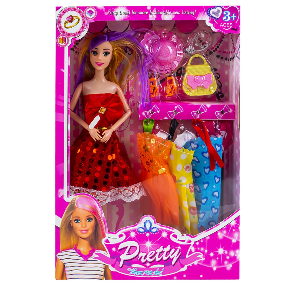 – Setul contine: 1 x papusa, 1 x palarie, 1 x colier, 1x gentuta, 1 x pereche pantofi si 4 rochite care completeaza garderoba papusii.