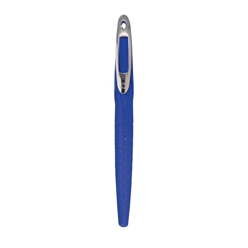 – Stilou my.pen are penita M din otel inoxidabil, corp din material plastic in culoare albastru cu alb, grip ergonomic anti-alunecare, capac cu clips metalic flexibil, alimentare cu patroane de cerneala.