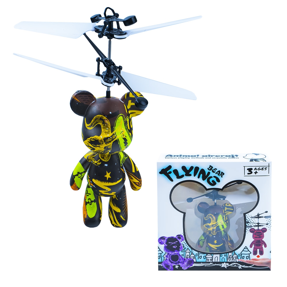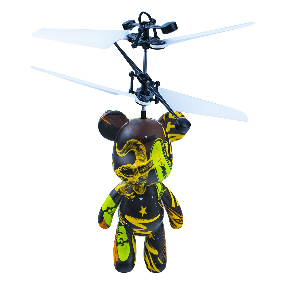 – Apasati butonul de pornire si puneti mana sub ursulet. Dupa 3-5 secunde, functia sa de zbor va fi activata si puteti controla ursuletul pentru a zbura in sus si in jos. Astfel va puteti bucura de minunate spectacole. Design-ul cu doua perechi de palete, plasate pe doua nivele, va asigura stabilitate in timpul zborului.